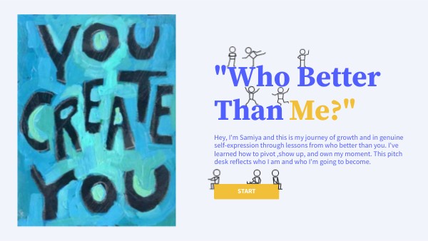 Hey, I'm Samiya and this is my journey of growth and in genuine self-expression through lessons from who better than you. I've learned how to pivot ,show up, and own my moment. This pitch desk reflects who I am and who I'm going to become.