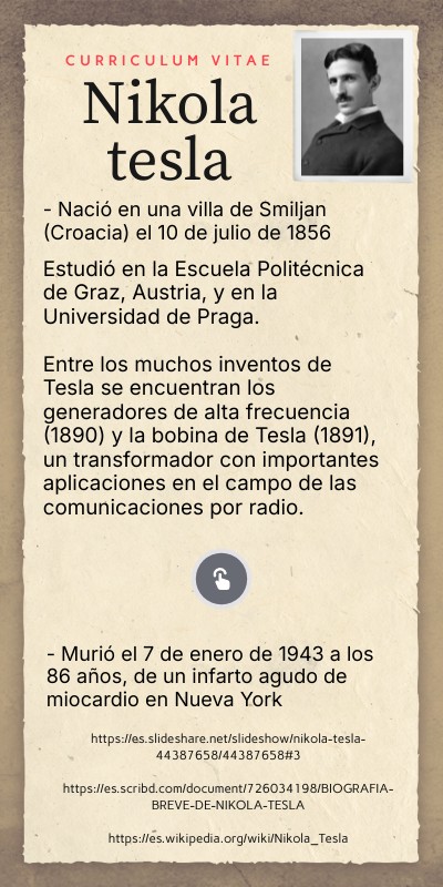 https://es.slideshare.net/slideshow/nikola-tesla-44387658/44387658#3https://es.scribd.com/document/726034198/BIOGRAFIA-BREVE-DE-NIKOLA-TESLA https://es.wikipedia.org/wiki/Nikola_Tesla