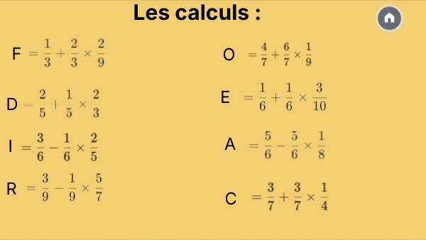 Chaque fractions correspond à une lettre . Pour trouver les lettres , tu dois donc effectuer les calculs proposés. Les résultats que tu auras trouvés te donneront un mot à décoder .
