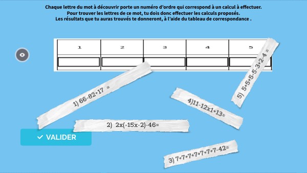 Chaque lettre du mot à découvrir porte un numéro d’ordre qui correspond à un calcul à effectuer.