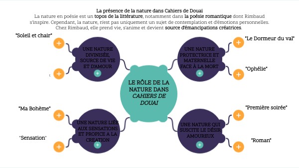 La présence de la nature dans Cahiers de Douai La nature en poésie est un topos de la littérature, notamment dans la poésie romantique dont Rimbaud s'inspire. Cependant, la nature, n'est pas uniquement un sujet de contemplation et d'émotions personnelles. Chez Rimbaud, elle prend vie, s'anime et devient source d'émancipations créatrices.
