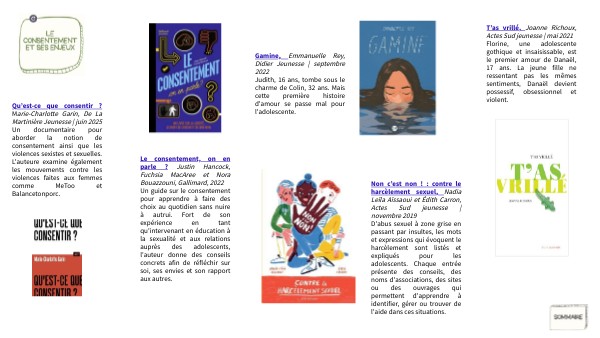 Le consentement, on en parle ? Justin Hancock, Fuchsia MacAree et Nora Bouazzouni, Gallimard, 2022 Un guide sur le consentement pour apprendre à faire des choix au quotidien sans nuire à autrui. Fort de son expérience en tant qu'intervenant en éducation à la sexualité et aux relations auprès des adolescents, l'auteur donne des conseils concrets afin de réfléchir sur soi, ses envies et son rapport aux autres.