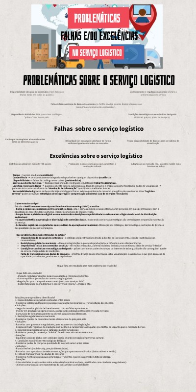Tempo → acesso imediato (excelência) Conveniência → serviço totalmente integrado e disponível em qualquer dispositivo (excelência) Disponibilidade → falhas de catálogo entre países (problemática) Serviço ao cliente/logística → transparência limitada e restrições regulatórias (Falha/Problemática). Logística reversa de dados → quando o cliente cancela subscrição ou deixa de consumir, a empresa recolhe feedback e dados de visualização → pode ser visto como uma forma de “devolução de informação” que alimenta melhorias futuras. Sustentabilidade digital→ embora não haja embalagens físicas, existe o problema do consumo energético dos servidores. Uma “logística reversa” poderia envolver estratégias de recuperação e compensação ambiental (uso de energias renováveis)