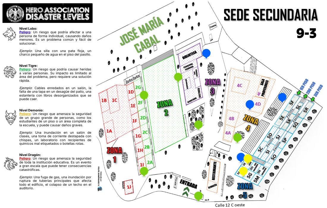 Nivel Lobo: Peligro: Un riesgo que podría afectar a una persona de forma individual, causando daños menores. Es un problema común y fácil de solucionar. Ejemplo: Una silla con una pata floja, un charco pequeño de agua en el piso del pasillo. Nivel Tigre: Peligro: Un riesgo que podría causar heridas a varias personas. Su impacto es limitado al área del problema, pero requiere una solución rápida. Ejemplo: Cables enredados en un salón, la falta de una tapa en un desagüe del patio, una estantería con libros desorganizados que se puede caer. Nivel Demonio: Peligro: Un riesgo que amenaza la seguridad de un grupo grande de personas, como los estudiantes de un piso o un área completa de la escuela, y puede causar daños graves. Ejemplo: Una inundación en un salón de clases, una toma de corriente destapada con chispas, un laboratorio con recipientes de químicos mal etiquetados o botellas rotas. Nivel Dragón: Peligro: Un riesgo que amenaza la seguridad de toda la institución educativa. Es un evento a gran escala que puede tener consecuencias catastróficas. Ejemplo: Una fuga de gas, una inundación por ruptura de tuberías principales que afecta todo el edificio, el colapso de un techo en el auditorio.