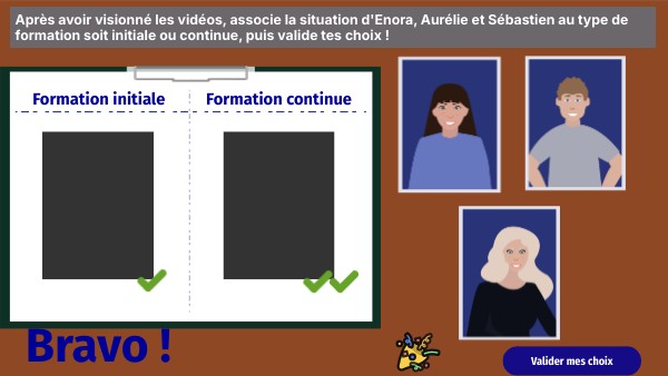 Après avoir visionné les vidéos, associe la situation d'Enora, Aurélie et Sébastien au type de formation soit initiale ou continue, puis valide tes choix !