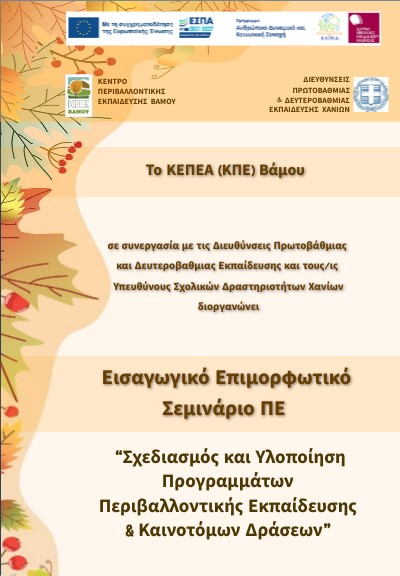Παρασκευή 24 Οκτωβρίου 2025 Χώρος: ΚΕΠΕΑ/ΚΠΕ Βάμου, Κεφαλάς Αποκορώνου 17.45 - 18.00: Προσέλευση - Εγγραφές. 18.00 - 18.15: Παιχνίδι γνωριμίας, Π.Ο. ΚΕΠΕΑ Βάμου 18.15 - 18.50: Παρουσίαση εκπαιδευτικών προγραμμάτων και δικτύων του ΚΕΠΕΑ/ΚΠΕ Βάμου καθώς και προγραμμάτων Erasmus+, Π.Ο. ΚΕΠΕΑ Βάμου 18.50- 19.00: Σύντομη παρουσίαση Προγραμμάτων & Δικτύων ΚΕΠΕΑ/ΚΠΕ Κρήτης 19.00 - 19.15: Διάλειμμα 19.15 - 19.45: Παρουσιάσεις Δράσεων και Σχολικών Προγραμμάτων που υλοποιήθηκαν από σχολεία Π/θμιας & Δ/θμιας Εκπ/σης της Περιφερειακής Ενότητας Χανίων 19.45 - 20.15: Ιδέες για τη δημιουργία σχολικής εφημερίδας, Π.Ο. ΚΕΠΕΑ Βάμου 20.15 - 20.45: Σχεδιασμός προγραμμάτων Σχολικών Δραστηριοτήτων- Εργαστήριο σχεδιασμού με τη μέθοδο Project, Αρετή Μαρματάκη, Υπεύθυνη Σχολικών Δραστηριοτήτων Δ/βάθμιας Εκπ/σης Ν. Χανίων 20.45 - 21.00: Ερωτήσεις – Συζήτηση Σάββατο 25 Οκτωβρίου 2025 Χώρος: Παλιά Πόλη Χανίων 08.45 - 09.00: Προσέλευση 09.00 - 11.30: Εκπαιδευτικό Πρόγραμμα «Χανιά. Μια βόλτα 5.500 χρόνων» στην Π. Πόλη Χανίων, Π.Ο. ΚΕΠΕΑ/ΚΠΕ Βάμου 11.30 - 11.45: Διάλειμμα 11.45 - 13.30: Δημιουργική Γραφή – Εργαστήριο, Ζοέλ Λοπινό, Συγγραφέας 13.30 - 14.00: Ερωτήσεις – Συζήτηση – Αξιολόγηση σεμιναρίου.