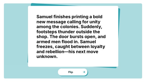 Samuel finishes printing a bold new message calling for unity among the colonies. Suddenly, footsteps thunder outside the shop. The door bursts open, and armed men flood in. Samuel freezes, caught between loyalty and rebellion—his next move unknown.