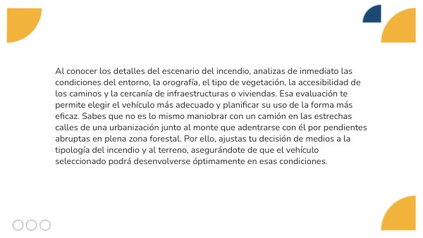 Mientras os aproximáis al lugar del incendio, verificas que el equipo mantenga una disposición plenamente operativa antes del despliegue. Compruebas las comunicaciones internas, todos los miembros llevan sus equipos de radio sintonizados en el canal adecuado y se escuchan con nitidez las comunicaciones. Te cercioras además de que cada bombero tenga correctamente colocado y ajustado su equipo de protección individual, desde el casco hasta el chaquetón ignífugo. Finalmente, repasas mentalmente la estrategia acordada para el momento de la llegada, visualizando las primeras acciones que ejecutaréis en cuanto estéis en la zona de intervención.
