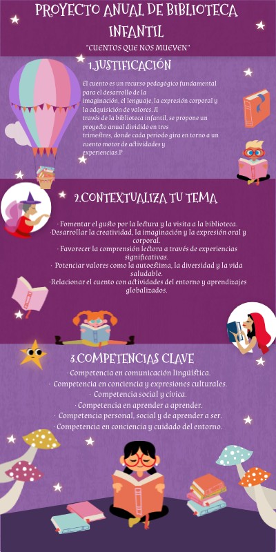 El cuento es un recurso pedagógico fundamental para el desarrollo de la imaginación, el lenguaje, la expresión corporal y la adquisición de valores. A través de la biblioteca infantil, se propone un proyecto anual dividido en tres trimestres, donde cada periodo gira en torno a un cuento motor de actividades y experiencias.P