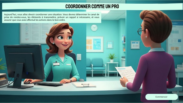 Aujourd'hui, vous allez devoir coordonner une situation. Vous devrez déterminer le canal de prise de rendez-vous, les éléments à transmettre, prévoir un rappel si nécessaire, et vous assurer que vous avez effectué les actions dans le bon ordre.