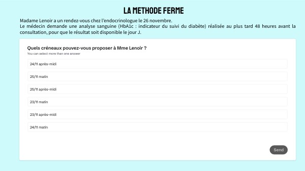 Madame Lenoir a un rendez-vous chez l’endocrinologue le 26 novembre.Le médecin demande une analyse sanguine (HbA1c : indicateur du suivi du diabète) réalisée au plus tard 48 heures avant la consultation, pour que le résultat soit disponible le jour J.