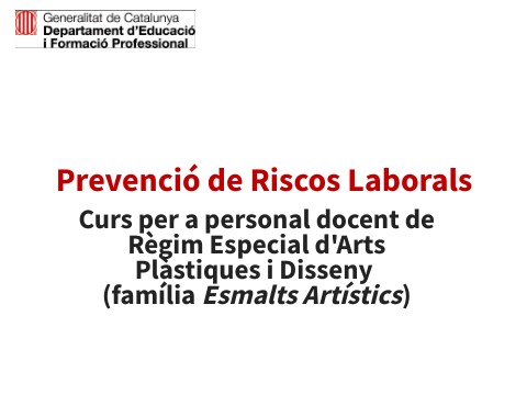 Aquest curs compleix amb allò que preveu la llei quant a l'obligació d'informar i formar al personal treballador sobre els riscos derivats del seu lloc de treball. El destinatari d'aquest curs és personal docent d'ensenyaments de règim especial. En concret, d'arts plàstiques i disseny, família d'Esmalts Artístics. Així es tracten riscos i mesures preventives comunes, ja que el nivell d'especialització en aquests tipus d'ensenyaments és molt gran i divers. Es pretén que aquest personal conegui conceptes bàsics en matèria de prevenció de riscos laborals, i que estigui informat i format dels riscos i mesures preventives que deriven tant de la tasca docent en general com la de la tasca específica de l'ensenyament impartit.
