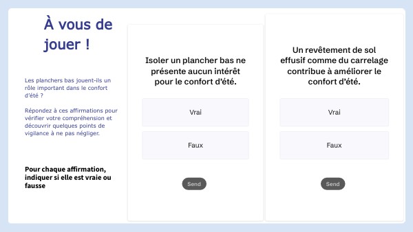 Les planchers bas jouent-ils un rôle important dans le confort d’été ? Répondez à ces affirmations pour vérifier votre compréhension et découvrir quelques points de vigilance à ne pas négliger.