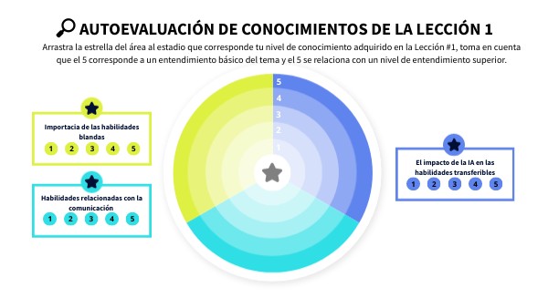Arrastra la estrella del área al estadio que corresponde tu nivel de conocimiento adquirido en la Lección #1, toma en cuenta que el 5 corresponde a un entendimiento básico del tema y el 5 se relaciona con un nivel de entendimiento superior.