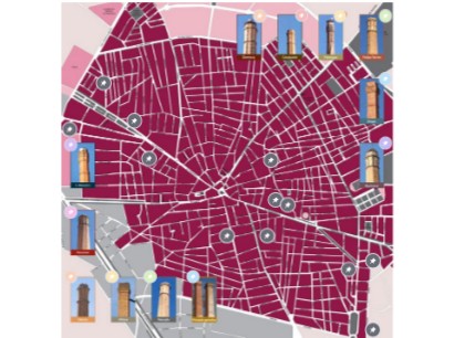 TORRES, 1944.La familia Torres encarga en el año 1944 la construcción de una chimenea a José Goig Lorente. Aunque no es de las más altas de Goig -32 metros-, sí es de las más peculiares y bonitas. Lo más peculiar está situado cerca de la parte más alta: unas guras en forma de rombo. Estos adornos peculiares hacen un llamativo conjunto que no tiene ninguna otra chimenea. In 1944 the Torres family commissioned José Goig Lorente to build a chimney and. Although at 32 metres it is not the highest chimney built by Goig, it is one of the most unusual and stunning. The most unusual feature is to be found close to the top: a series of diamond-shaped figures These unusual decorations are a striking sight, not found on any other chimney.