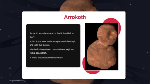 Arrokoth was discovered in the Kuiper Belt in 2014. In 2019, the New Horizons spacecraft flew by it and took this picture. It is the furthest object humans have explored with a spacecraft. It looks like a flattened snowman!