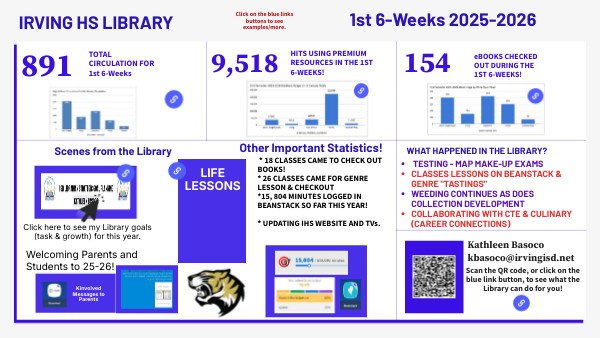 * 18 CLASSES CAME TO CHECK OUT BOOKS! * 26 CLASSES CAME FOR GENRE LESSON & CHECKOUT *15, 804 MINUTES LOGGED IN BEANSTACK SO FAR THIS YEAR! * UPDATING IHS WEBSITE AND TVs.