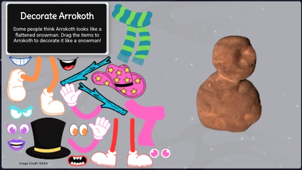 Some people think Arrokoth looks like a flattened snowman. Drag the items to Arrokoth to decorate it like a snowman!