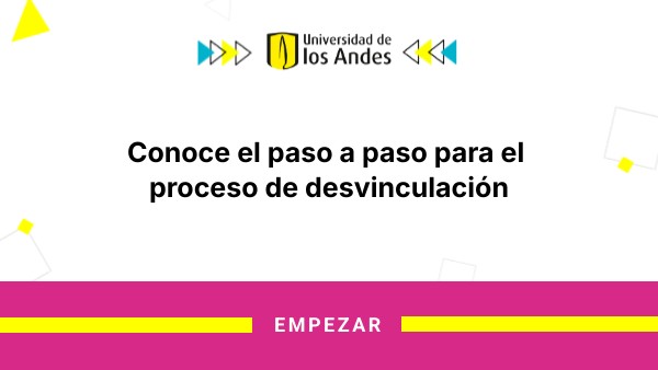 El jefe inmediato o empleado reporta la novedad de retiro a través de una de las siguientes opciones: • Mesa de Servicios enlace: missolicitudes.uniandes.edu.co/s/Opción: Gestión Humana → Realizar solicitud → Solicitud → Nómina -Desvinculaciones → Desvinculación. • Correo electrónico a: novedadesnomina@uniandes.edu.co y en el mismo copiar a su jefe inmediato.2. Conozca el detalle de cada paso