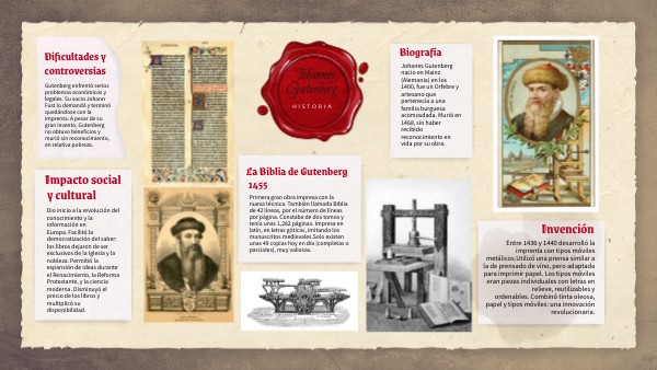 Johanes Gutenberg nacio en Mainz (Alemania) en los 1400, fue un Orfebre y artesano que pertenecía a una familia burguesa acomosdada. Murió en 1468, sin haber recibido reconocimiento en vida por su obra.