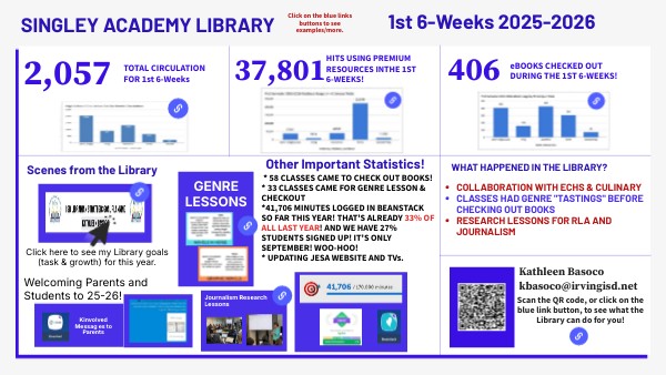 * 58 CLASSES CAME TO CHECK OUT BOOKS! * 33 CLASSES CAME FOR GENRE LESSON & CHECKOUT *41,706 MINUTES LOGGED IN BEANSTACK SO FAR THIS YEAR! THAT'S ALREADY 33% OF ALL LAST YEAR! AND WE HAVE 27% STUDENTS SIGNED UP! IT'S ONLY SEPTEMBER! WOO-HOO! * UPDATING JESA WEBSITE AND TVs.
