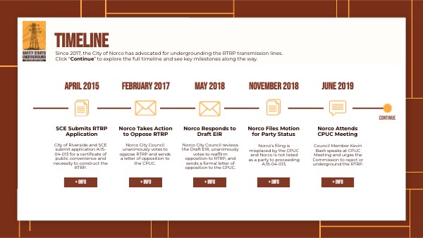 Since 2017, the City of Norco has advocated for undergrounding the RTRP transmission lines. Click “Continue” to explore the full timeline and see key milestones along the way.