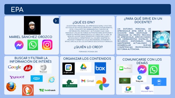 Un Entorno Personal de Aprendizaje (EPA), o PLE por sus siglas en inglés (Personal Learning Environment), es el conjunto de herramientas, fuentes de información, personas y actividades que cada individuo utiliza de forma autónoma para gestionar y dirigir su propio aprendizaje a lo largo de la vida. Se basa en un enfoque pedagógico personalizado y tecnológico, permitiendo al usuario adaptar su proceso formativo a sus necesidades, intereses y ritmo, más allá de los entornos educativos formales.