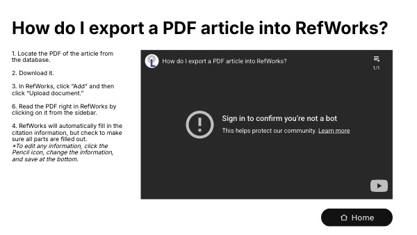 1. Locate the PDF of the article from the database. 2. Download it. 3. In RefWorks, click “Add” and then click “Upload document.” 6. Read the PDF right in RefWorks by clicking on it from the sidebar. 4. RefWorks will automatically fill in the citation information, but check to make sure all parts are filled out. *To edit any information, click the Pencil icon, change the information, and save at the bottom.