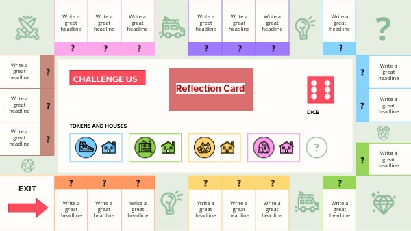 Each player must choose a color: blue, green, yellow, or pink. This gives them a token to mark their position and 10 houses to indicate the 'challenge' properties they acquire throughout the game. Each player must take their colored token and place it on the starting space. To start playing, click on the dice and move your token to the corresponding space. On each space, there must be one or more questions. If you answer correctly, place one of your houses on that space. Congratulations, you have acquired a new property! In the case you cannot answer it, you will either draw a reflection card, or ask for help from other players. If other player helped you out, they will gain one credit, by adding their house on it. Special spaces: spaces with icons may contain penalties such as "The player pays light taxes: loses 2 houses". Answer the question correctly to avoid the penalty! The player who has the most houses on the board once all spaces are occupied will win.