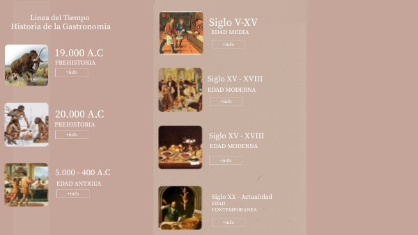 En la civilizacion Egipcia, Hebrea, Mesopotamica, Persa, Roma, China, Grecia y el Imperio Bizantino se caracterizo por primera vez la coccion de carnes y huevos de diferentes aves. Ademas en el Imperio Egipcio realizaron las fermentaciones de bebudas para el vino y comenzaron la primera produccion de pan. Tambien se consumian cereales y alimentos ligeramente condimentados.