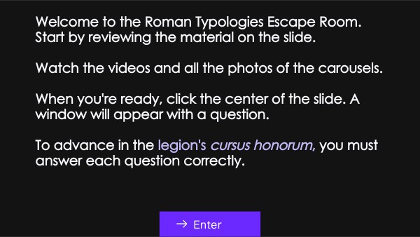 Welcome to the Roman Typologies Escape Room. Start by reviewing the material on the slide. Watch the videos and all the photos of the carousels. When you're ready, click the center of the slide. A window will appear with a question. To advance in the legion's cursus honorum, you must answer each question correctly.