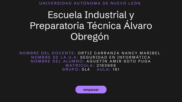 Nombre del docente: Ortiz carranza nancy maribel nombre de la U.a: Seguridad en informática Nombre del alumno: agustín amir soto puga matricula: 2163966 Grupo: 5l4 aULA: 161