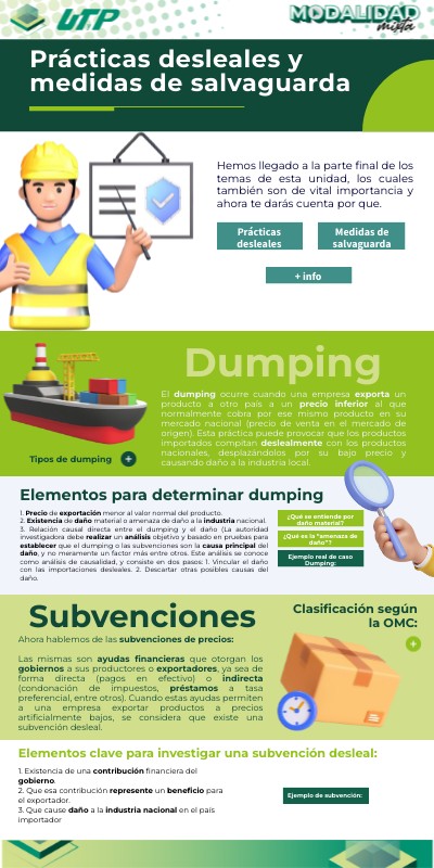 Al momento, tu ya tienes noción de varios elementos que conforman el comercio internacional, pero en este contexto también existen las prácticas desleales que son aquellas acciones realizadas por un país o empresa que distorsionan la competencia, afectando negativamente a los productores nacionales. Las más comunes son el dumping (venta de productos a precios inferiores a su valor normal) y las subvenciones otorgadas por gobiernos que reducen artificialmente los costos de exportación. Estas prácticas pueden generar un daño económico a las industrias locales, desplazando su producción y empleo.