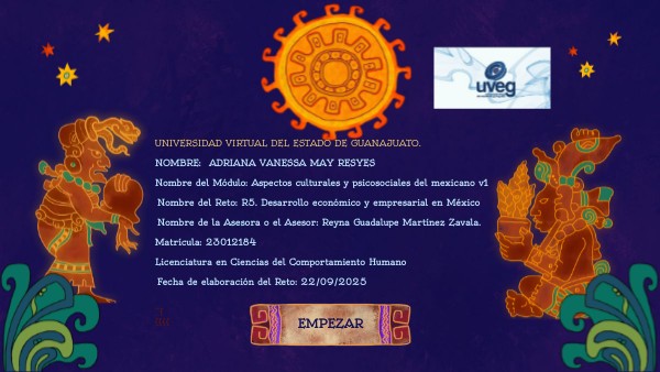UNIVERSIDAD VIRTUAL DEL ESTADO DE GUANAJUATO. NOMBRE: ADRIANA VANESSA MAY RESYES Nombre del Módulo: Aspectos culturales y psicosociales del mexicano v1 Nombre del Reto: R5. Desarrollo económico y empresarial en México Nombre de la Asesora o el Asesor: Reyna Guadalupe Martínez Zavala. Matrícula: 23012184 Licenciatura en Ciencias del Comportamiento Humano Fecha de elaboración del Reto: 22/09/2025 ´´{ {{{{