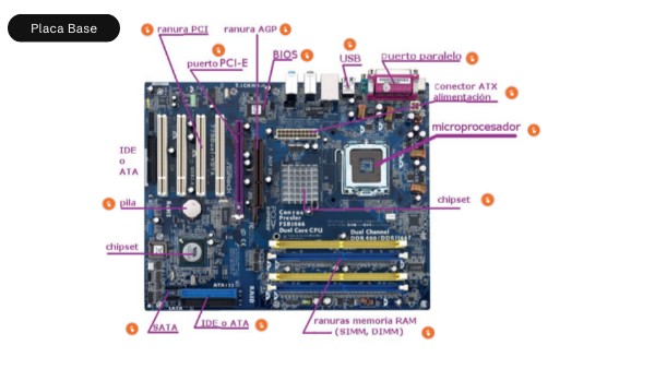 La placa base es el componente principal de un ordenador que actúa como una "columna vertebral", conectando y facilitando la comunicación entre todos los demás componentes del sistema, como el procesador (CPU), la memoria RAM, la tarjeta gráfica, los discos duros y los periféricos externos.