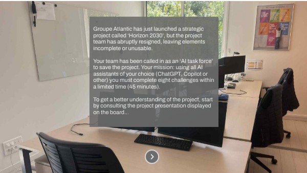 Groupe Atlantic has just launched a strategic project called ‘Horizon 2030’, but the project team has abruptly resigned, leaving elements incomplete or unusable. Your team has been called in as an ‘AI task force’ to save the project. Your mission: using all AI assistants of your choice (ChatGPT, Copilot or other) you must complete eight challenges within a limited time (45 minutes). To get a better understanding of the project, start by consulting the project presentation displayed on the board...