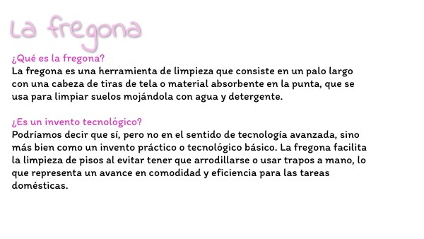 Curiosidades: -Antes de la fregona moderna, se usaban trapos o bayetas en el suelo, y a menudo había que arrodillarse para limpiar. -Existen muchos tipos de fregonas hoy en día: de microfibra, de esponja, desechables, etc. -La fregona no solo es un símbolo de limpieza, sino también un invento que mejoró la higiene y la calidad de vida. -La palabra "fregona" antes era un insulto; luego pasó a ser el nombre del invento. -Inspirada en la limpieza de aviones en EE. UU. -Al principio la gente no quería usarla; no se fiaban de su eficacia. -Hay un monumento a la fregona en Logroño. -Tiene su "Día Mundial" no oficial: 30 de enero. -Más de 100 millones de fregonas se usan hoy en día en el mundo.