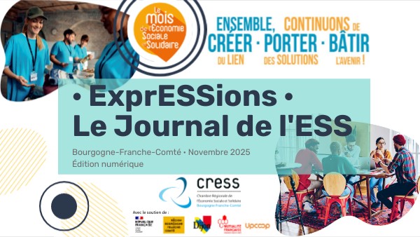 Expressions, Le Journal de l'ESS · Édition Novembre 2025 Éditeur de la publication : CRESS BFC Conception du projet : CRESS BFC Rédacteurs en chef : Tatiana Desmarest, présidente de la CRESS Bourgogne-Franche-Comté Directeur de la publication : François Baulard Contributeurs : United Schools, Observatoire régional de l'ESS Création et conception graphique : Océane Albéri-Comparet, Genially Crédits photos : Tremplin homme et patrimoine