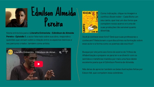 Nesta entrevista para o Literafro Entrevista - Edimilson de Almeida Pereira - Episódio 1, o autor fala mais sobre sua obra, responde a questões que versam sobre a relação entre os aspectos teóricos e seu percurso criador, também como artista.