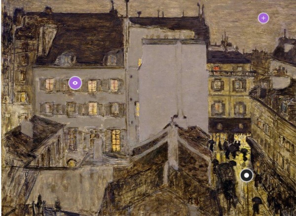 Il quadro rappresenta la Rue Tholozè del quartiere parigino "Montmartre", in una serata buia di pioggia. La luce proveniente dalle finestre degli appartamenti illuminati e dalle vetrine di qualche negozio, attira l'attenzione dello spettatore. La luce che riflette sul lastricato bagnato dalla pioggia, risalta le figure scure che passeggiano con degli ombrelli.