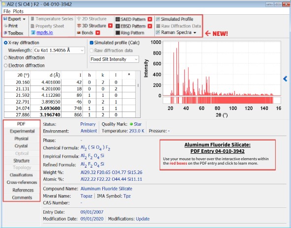 Classifications: This tab displays the various classifications for the PDF entry, such as the subfiles and mineral/zeolite classifications.