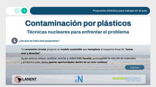 Los plásticos forman parte de nuestra vida diaria, pero su uso masivo también genera un gran problema: los microplásticos, diminutas partículas que llegan al agua, al suelo e incluso a los alimentos. Para enfrentar este desafío es importante conocer cuáles son sus características y qué posibilidades existen para reducirlos o reciclarlos. A partir del uso del recurso "Contaminación por plásticos: ciencia nuclear para enfrentar el problema" proponemos una serie de actividades para trabajar estos contenidos en clase. Reforzaremos los conceptos de economía circular, los principios básicos de la tecnología nuclear, sus aportes para monitorear el problema y la irradiación como alternativa al reciclado tradicional