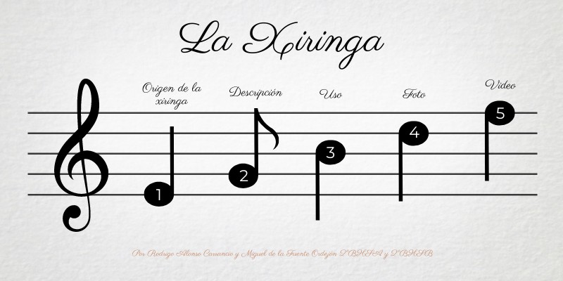 El término "xiringa" o siringa musical tiene origen en la Antigua Grecia y está estrechamente ligado a la mitología griega y al término σῦριγξ (sýrinx), que designa una caña o tubo. El instrumento, una flauta de Pan, fue creado por el dios Pan quien, al perseguir a la ninfa Siringa, la transformó en cañas. Pan cortó estas cañas para crear su instrumento, dando así origen a la siringa, que también es conocida como flauta de Pan