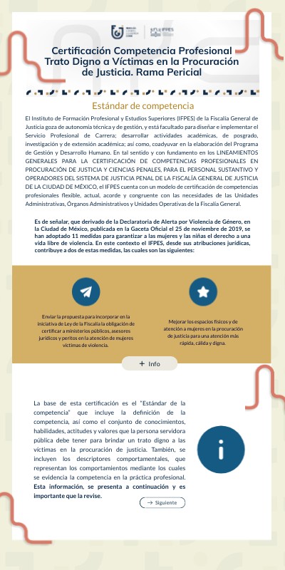 El Instituto de Formación Profesional y Estudios Superiores (IFPES) de la Fiscalía General de Justicia goza de autonomía técnica y de gestión, y está facultado para diseñar e implementar el Servicio Profesional de Carrera; desarrollar actividades académicas, de posgrado, investigación y de extensión académica; así como, coadyuvar en la elaboración del Programa de Gestión y Desarrollo Humano. En tal sentido y con fundamento en los LINEAMIENTOS GENERALES PARA LA CERTIFICACIÓN DE COMPETENCIAS PROFESIONALES EN PROCURACIÓN DE JUSTICIA Y CIENCIAS PENALES, PARA EL PERSONAL SUSTANTIVO Y OPERADORES DEL SISTEMA DE JUSTICIA PENAL DE LA FISCALÍA GENERAL DE JUSTICIA DE LA CIUDAD DE MÉXICO, el IFPES cuenta con un modelo de certificación de competencias profesionales flexible, actual, acorde y congruente con las necesidades de las Unidades Administrativas, Órganos Administrativos y Unidades Operativas de la Fiscalía General.