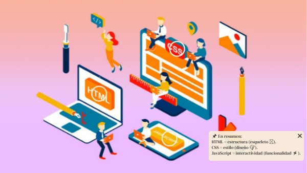 📌 En resumen: HTML = estructura (esqueleto 🦴). CSS = estilo (diseño 🎨). JavaScript = interactividad (funcionalidad ⚡).