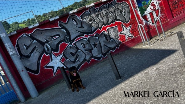 La pared con grafitis y el escudo pintado son parte de la identidad del campo. Ese arte urbano le da un toque único, como si el lugar hablara por sí mismo.