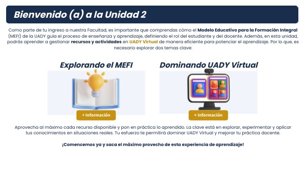 Como parte de tu ingreso a nuestra Facultad, es importante que comprendas cómo el Modelo Educativo para la Formación Integral (MEFI) de la UADY guía el proceso de enseñanza y aprendizaje, definiendo el rol del estudiante y del docente. Además, en esta unidad, podrás aprender a gestionar recursos y actividades en UADY Virtual de manera eficiente para potenciar el aprendizaje. Por lo que, es necesario explorar dos temas clave: