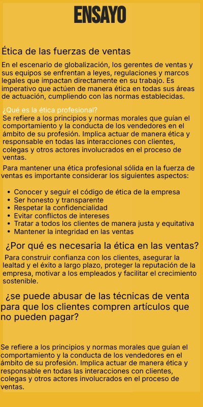 Se refiere a los principios y normas morales que guían el comportamiento y la conducta de los vendedores en el ámbito de su profesión. Implica actuar de manera ética y responsable en todas las interacciones con clientes, colegas y otros actores involucrados en el proceso de ventas.