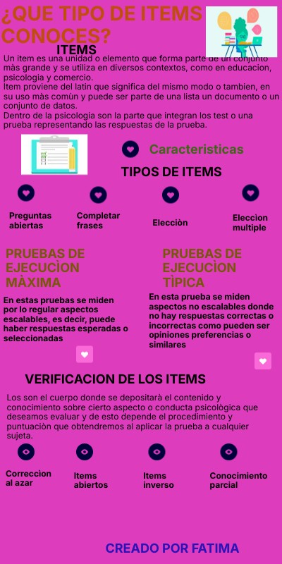 Los son el cuerpo donde se depositarà el contenido y conocimiento sobre cierto aspecto o conducta psicològica que deseamos evaluar y de esto depende el procedimiento y puntuaciòn que obtendremos al aplicar la prueba a cualquier sujeta.