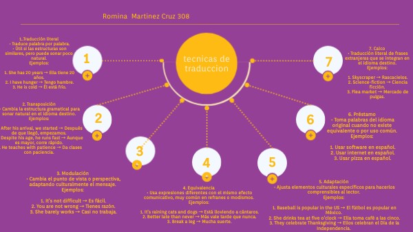 1..Traducción literal • Traduce palabra por palabra. • Útil si las estructuras son similares, pero puede sonar poco natural. Ejemplos: 1. She has 20 years → Ella tiene 20 años. 2. I have hunger → Tengo hambre. 3. He is cold → Él está frío.